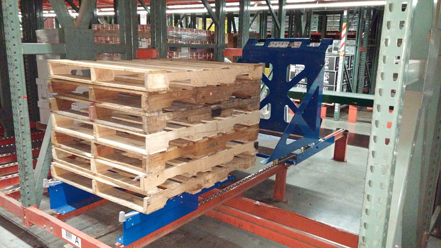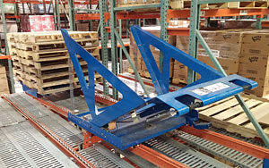 The Pallet Return Device (PRDTM) is a pallet handling solution or pallet return solution that many operations could benefit from, particularly distribution centers. This particular pallet return system works to increase the safety of your area by reducing the risks of handling pallets with a lifting method that reduces strain on the lower back. The unit also reduces the risks of falling pallets because the movement to the end of the rack units is controlled as opposed to gravity fed.