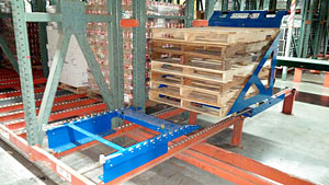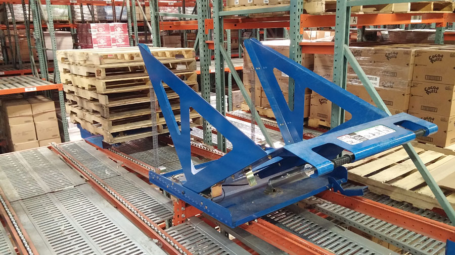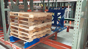 The PRDTM mounts to pallet flow rails that are designed in pick modules made of pallet racking. Since the PRDTM makes a perfect stack of pallets every time, it saves labor costs as pickers no longer have to struggle to make a perfect stack, and forklift drivers now avoid reshaping pallet stacks when ready to be removed from the modules.